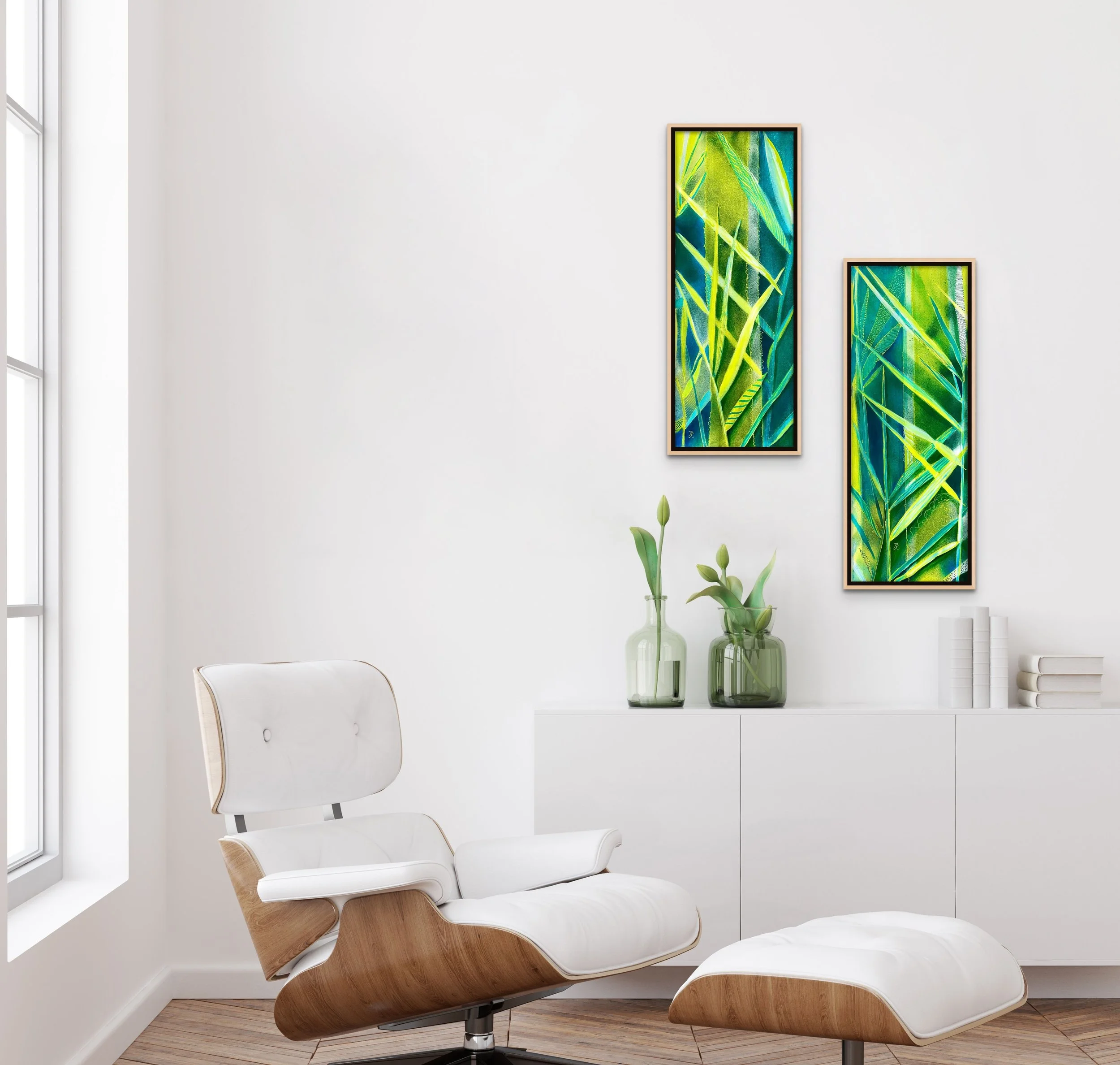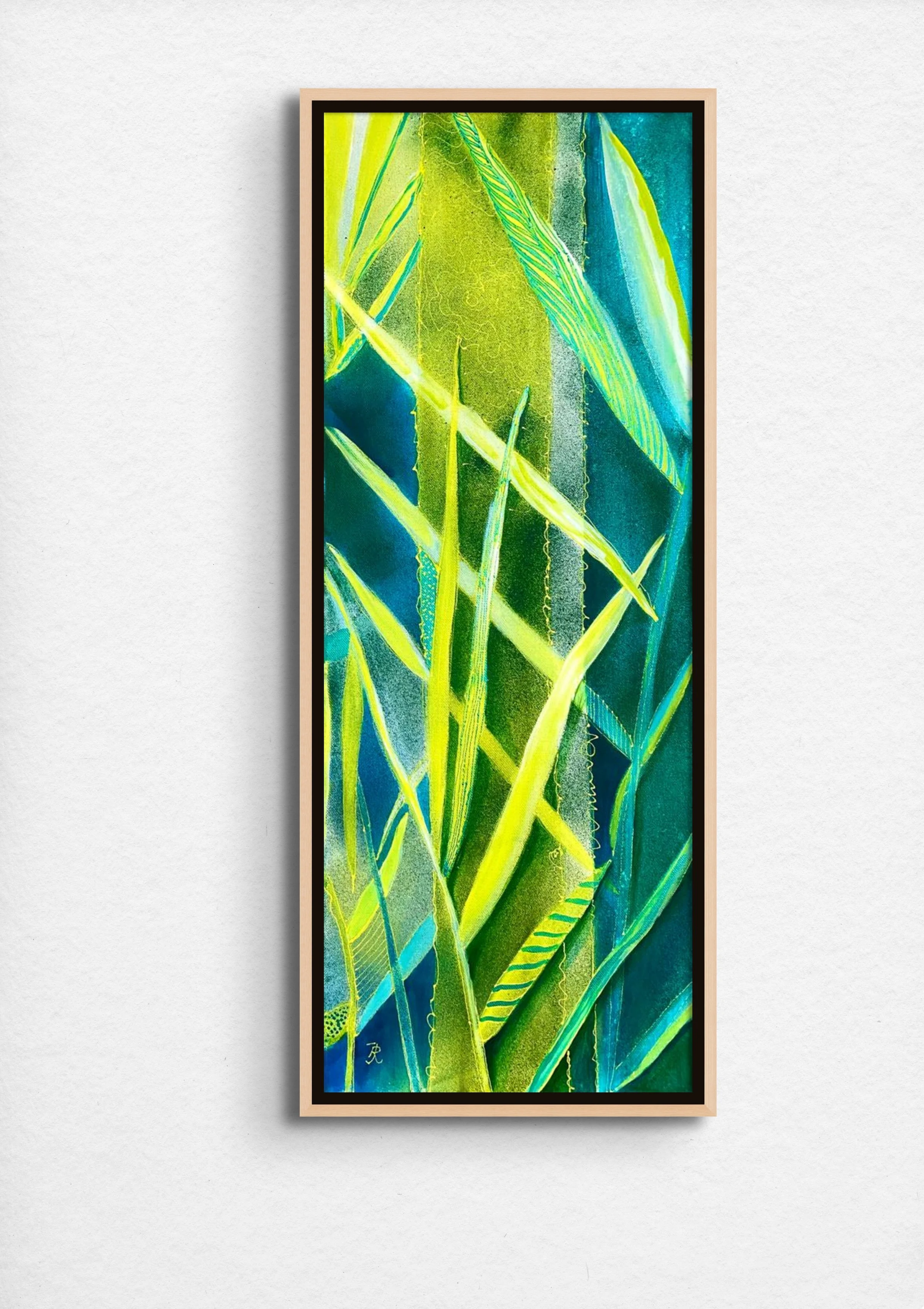 "Raschelndes Schilf" sind zwei außergewöhnliche Airbrush-Gemälde, die die feine Kunst der Stilisierung mit Finelinern meisterhaft demonstrieren. Jedes Bild dieser Serie, benannt "Verwunschene Verwandlung", ist ein eigenständiges Kunstwerk, das einen Moment des Übergangs einfängt, in dem sich das Bekannte in abstrakte Formen auflöst und eine neue Dimension der Realität entsteht. Die leuchtenden Grüntöne und sanften Linienführungen laden dazu ein, die Natur in ihrem ständigen Wandel zu betrachten und sich von der eleganten Verschmelzung des Vertrauten mit dem Fantastischen verzaubern zu lassen.